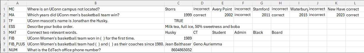 | Fill in the Blank | FIB TAB question text TAB answer text TAB answer two text Text within ( ) may be repeated for each of the answers that are part of the Fill in the Blank question. The maximum number of answers is 100. |